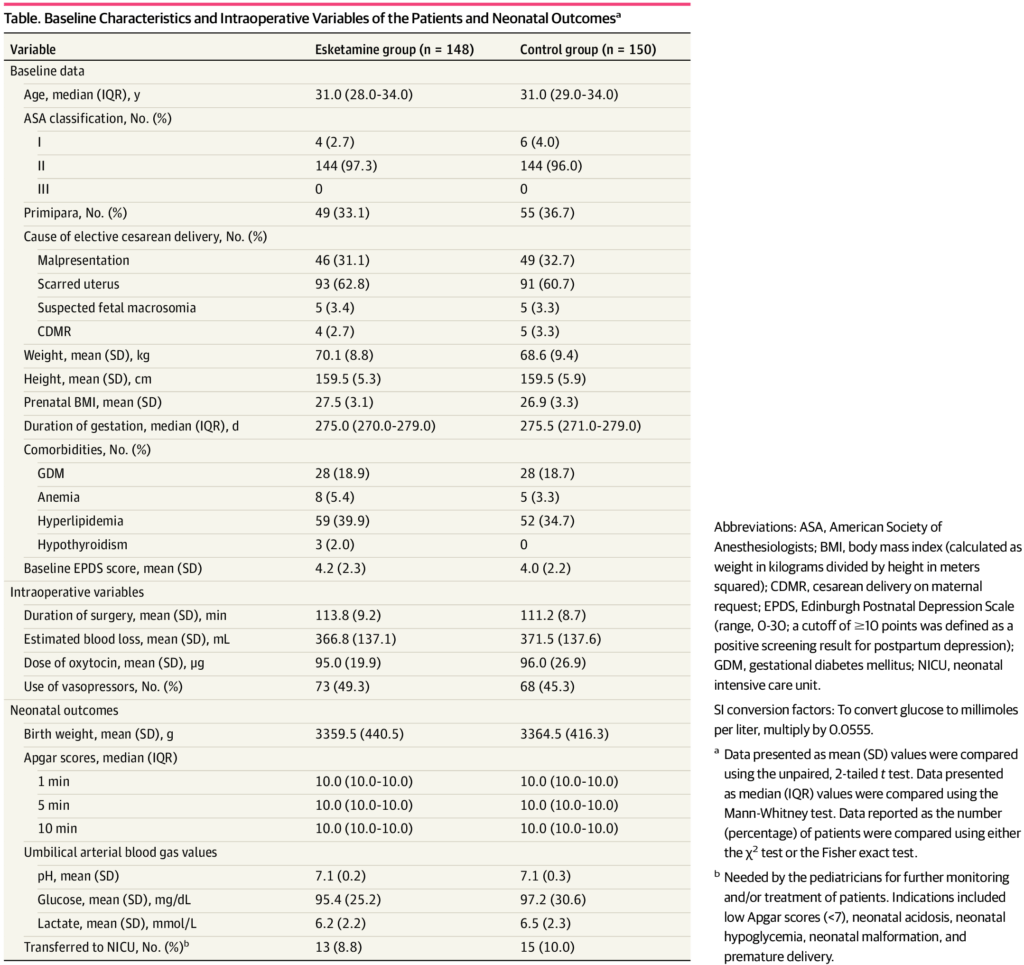Um total de 1225 mulheres grávidas foram avaliadas para elegibilidade entre 1º de janeiro de 2022 e 1º de janeiro de 2023. Destas, 357 eram elegíveis, e 150 foram inscritas e aleatoriamente designadas para os grupos de escetamina e controle. Entre as pacientes inscritas, 2 mulheres recusaram o acompanhamento no 5º dia pós-parto, e 298 mulheres foram incluídas na análise de intenção de tratar modificada (148 no grupo de escetamina [idade mediana, 31,0 anos (IQR, 28,0-34,0 anos)] e 150 no grupo de controle [idade mediana, 31,0 anos (IQR, 29,0-34,0 anos)]; Figura 1 ). As características basais, os dados intraoperatórios e os resultados neonatais foram bem equilibrados entre os 2 grupos ( Tabela ). A maioria dos pacientes foi classificada como ASA classe II (grupo escetamina, 97,3% [144 de 148]; grupo controle, 96,0% [144 de 150]) e multíparas (grupo escetamina, 66,9% [99 de 148]; grupo controle, 63,3% [95 de 150]). As pontuações EPDS basais médias (DP) foram 4,2 (2,3) e 4,0 (2,2) nos grupos escetamina e controle, respectivamente.