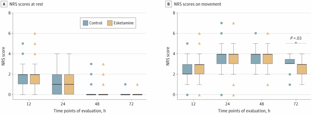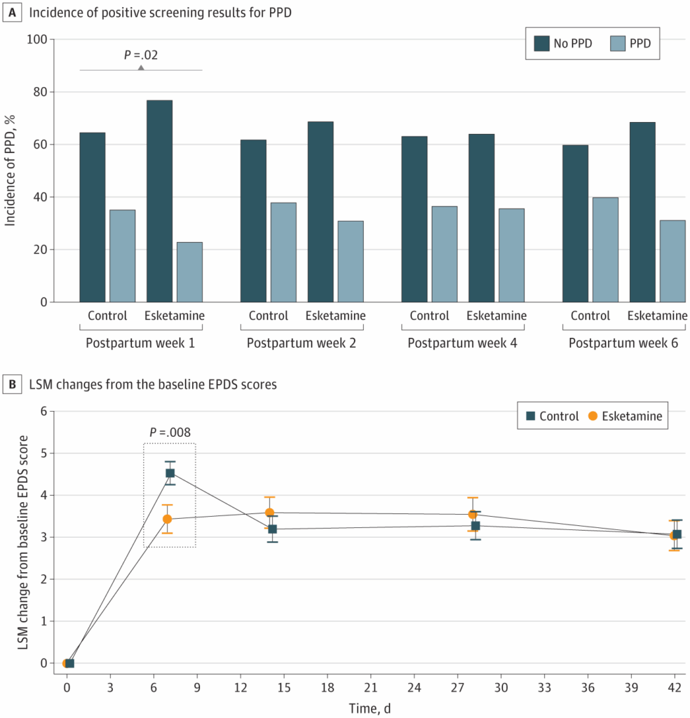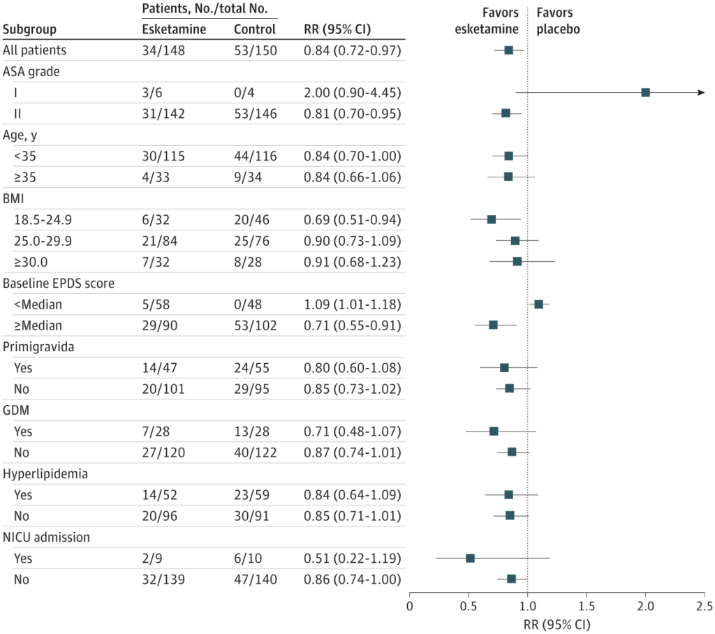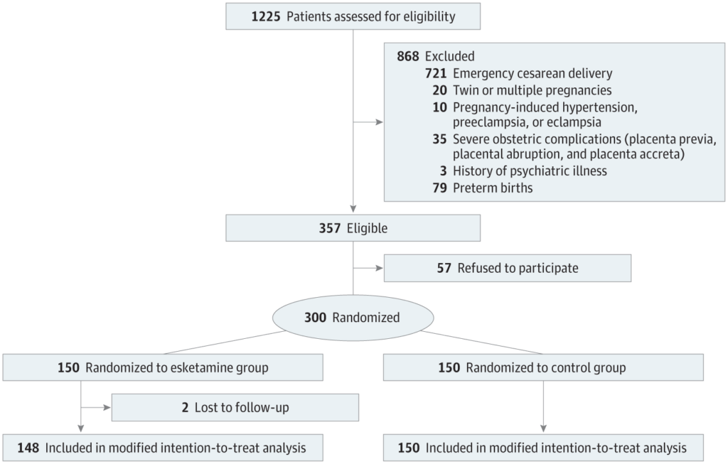 Recentemente, a escetamina, um novo antagonista do receptor NMDA com maior afinidade do que a cetamina, tem sido usada em vários países, incluindo a China. Como uma resolução dextral da cetamina, a escetamina demonstrou melhorar a eficácia de anestésicos e analgésicos, com um efeito antidepressivo semelhante ao seu antecessor. 24 , 25 Numerosos estudos descobriram que um spray nasal de escetamina poderia induzir e sustentar rapidamente efeitos benéficos para pacientes com diagnóstico de depressão resistente ao tratamento e risco de suicídios. 26-29 Estudos anteriores também descobriram que, para mulheres que passaram por partos cesáreos, uma administração preventiva de escetamina, seja pela via intratecal ou intravenosa, poderia produzir efeitos analgésicos seguros e eficazes. 30 , 31 Dada sua eficácia bidirecional como analgésico e antidepressivo, realizamos um ensaio clínico duplo-cego e randomizado para investigar os efeitos da administração adjuvante de escetamina perioperatória durante cesariana em pacientes com DPP.